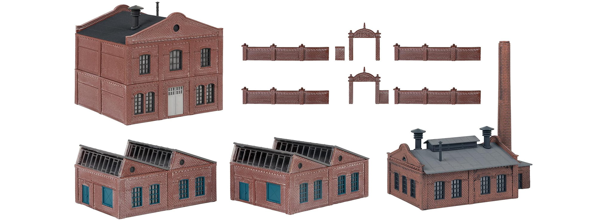 Fabrik aus der Jahrhundertwende mit roten Backsteinwänden und einer großen Halle mit angebauten Kaminhaus und imposantem Schornstein. Ein großzügiges Ensemble aus dem Hauptgebäude sowie zwei kleineren Hallen mit markanten Dachoberlichtern ergänzen die Szenerie. Zudem liegen dem Bausatz zwei repräsentative Backsteinmauerumzäunungen mit Toren bei.
