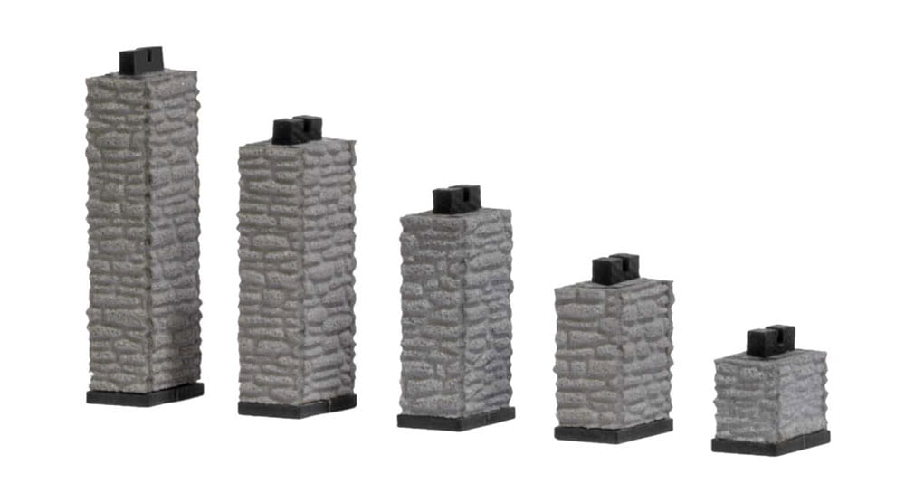 Inhalt: 5 Brückenpfeiler ca. 13, 21, 29, 37 und 46 mm hoch. Passend für Brückenelemente 12385 bzw. 12386 für gerade oder gebogene Feldbahngleise