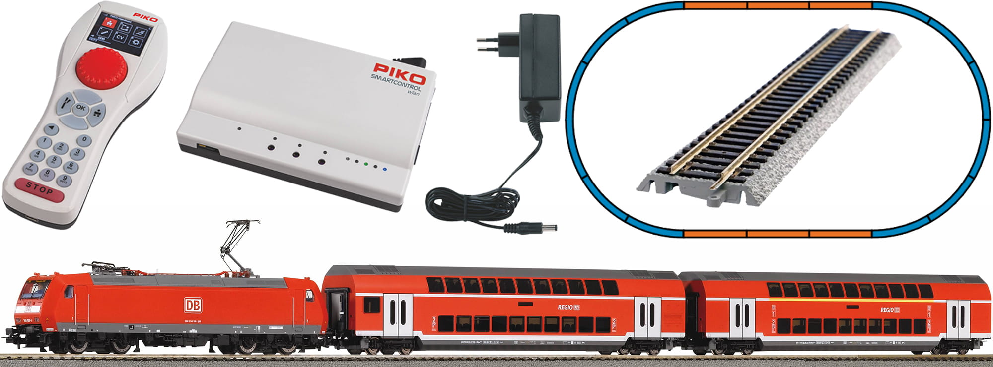 Das Set enthält eine E-Lok der BR 146 und 2 Doppelstockwagen sowie ein Oval mit PIKO A-Gleis mit Bettung.