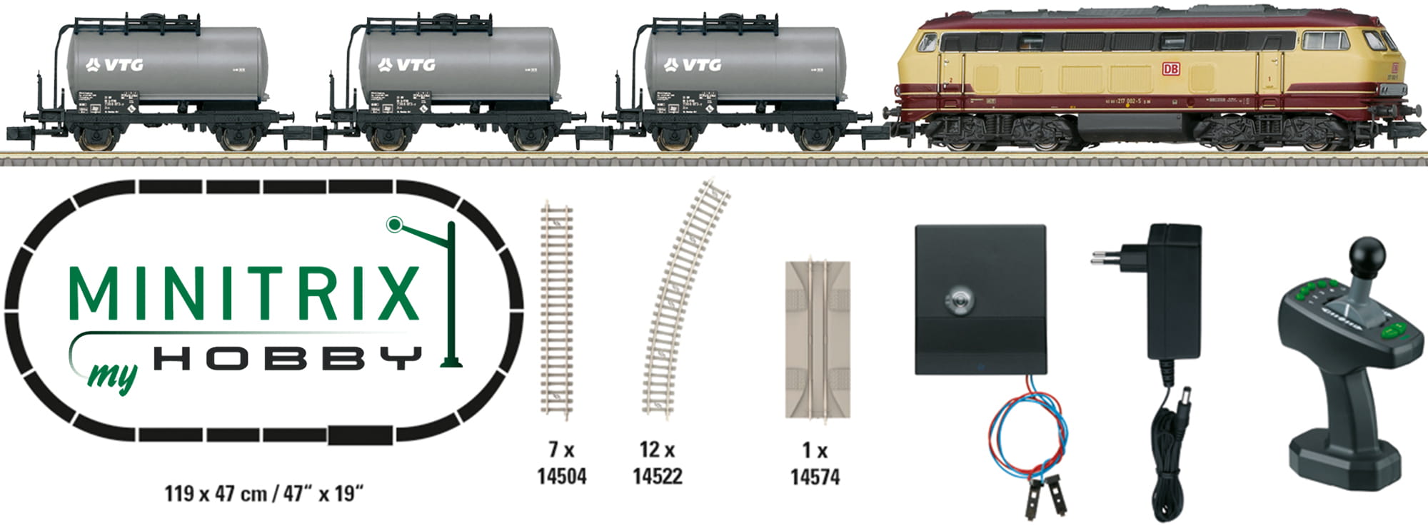 Modell: Fahrgestell der Lokomotive aus Metalldruckguss, mfx-DCC-Decoder, 5 poliger Motor mit Schwungmasse. Spitzensignal mit der Fahrtrichtung wechselnd, 4 Achsen angetrieben, Haftreifen. Wagen mit Kinematik für Kurzkupplung. Mit Schaltnetzteil und ein Minitrix Power Control Stick (kabelloses Infrarot-Steuergerät). Gleisoval mit gebogenen Gleisen im Radius 2 (Außenabmessungen: ca. 119 x 47 cm). Empfohlene Plattengröße: 130 x 55 cm. Gesamtlänge über Puffer 267 mm..