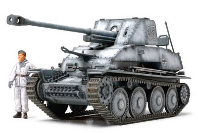 Der Marder III war ein deutscher Panzer des 2. Weltkriegs. Die deutschen hatten im Jahr 1941 einen Mangel an panzern, sodass auf Basis des Panzerkampfwagen 38(t) ein Panzer konstruoiert wurde. Als Hauptbewaffnung wurde die erbeutete sowjetische 7,62cm Feldkanone eingesetzt, die 122mm dicke Panzerung auf eine Entfernung von 1000m durchdringen konnte. Charakteristisch für den Marder III wat der ungewöhnlich hohe Farzeugaufbau. Er wurde im Jahr 1944 durch den Jagdpanzer 38(t) ersetzt. Als Besonderheit enthält dieser Bausatz eine Figur, und Kanonenrohr und Geschütz sind beweglich.