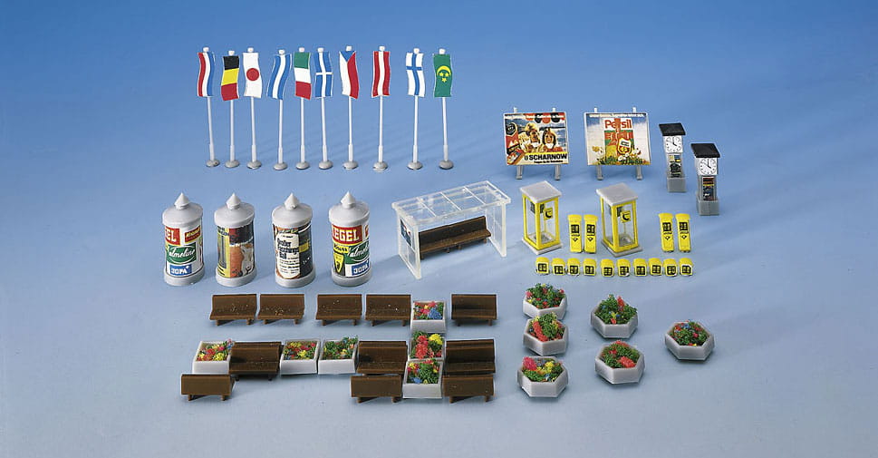 Stadtdekoration. Telefonzellen, Litfaßsäulen, Briefkästen, Plakatwände, Uhren, Blumenschalen, Fahnen, Wartehäuschen, Sitzbänke. 67 Teile. Ideal für die realistische Gestaltung von Städten und Dörfern