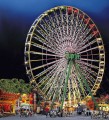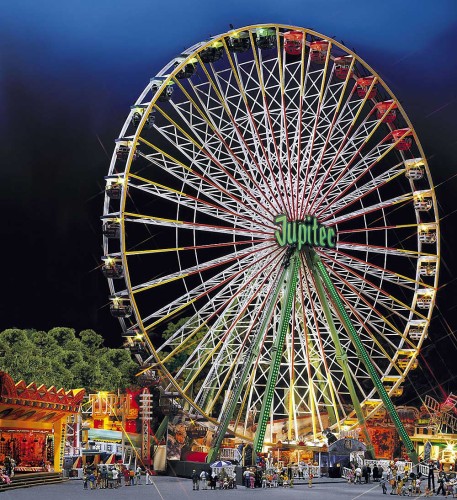Originalfahrgeschäft der Firma Nauta-Bussink, im Besitz des Schaustellers Barth-Kipp in Bonn. Hier herrschen ganz neue Dimensionen: 36 farbige, beleuchtbare Gondeln, Gesamthöhe von 52,0 cm, Jupiter-Schriftzug, Kassenhaus und vordere Stützstreben lassen sich effektvoll beleuchten. Mit Antriebsmotor (16 V, Wechselstrom). Für die Beleuchtung aller Gondeln des Jupiter-Schriftzuges und der vorderen Stützstreben wird das Riesenrad-Lichtset 140471 benötigt, das nachträglich montierbar ist