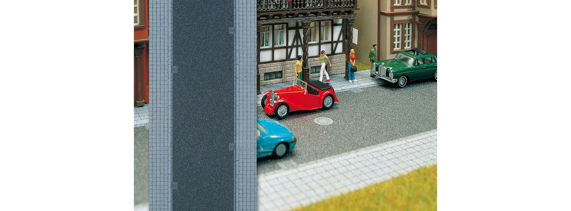 Stadtstraße mit Gehweg, Kanaldeckel und Gullys. Busch Straßenbänder sind selbstklebend und hochflexibel. Nur 0,6 mm dünn.