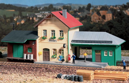 Ein kleines Empfangsgebäude mit Güterboden, Geräteschuppen, Toiletten und einigen typischen Ausschmückungsteilen. Für Anfängeranlagen oder als Zweitbahnhof geeignet