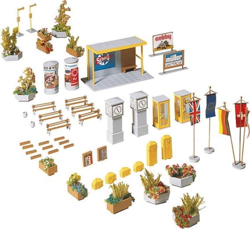 Telefonzellen, Litfaßsäulen, Briefkästen, Plakatwände, Uhren, Blumenschalen, Bus-Wartehäuschen, Sitzbänke, Abfallkörbe, Zigarettenautomaten – erst diese, teilweise in mehrfacher Ausführung vorhandenen Teile, geben einer Stadt oder einem Dorf ein realistisches Erscheinungsbild