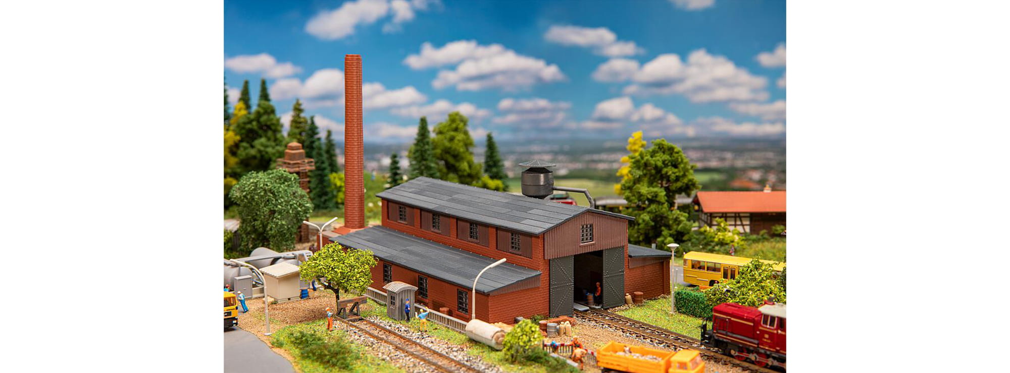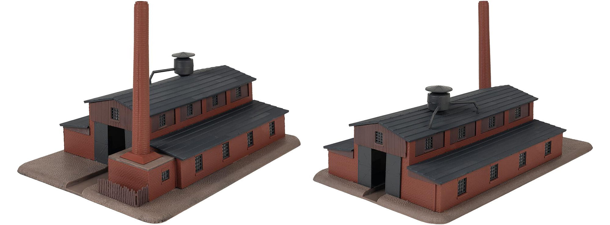Ein Industriegebäude mit backsteinverkleideter Fassade, markanten Hallentoren und einem beeindruckenden hohen Schornstein.