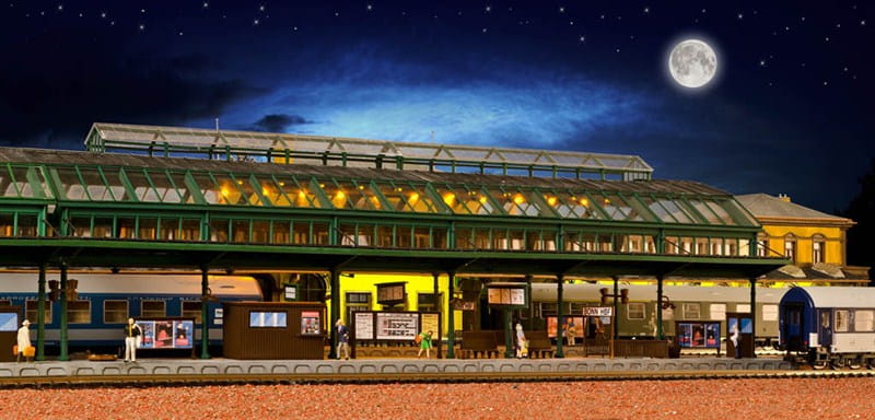 Mehrere Bahnsteige mit einer Hallenüberdachung gibt der aufschlußreiche Gestaltungsvorschlag wieder. Gleise und Bahnsteige werden hier von einer interessanten Hallenkonstruktion raumwirksam überdeckt. Das Eisen-Glas-System ist auch im Modell hervorragend nachempfunden. Das Konzept folgt in der Zusammenstellung einem Groß-Stadtbahnhof im H0-Maßstab. Hierbei dienen drei Bahnsteighallen der Überdachung der Bahnanlage (Gleisstraßen und Bahnsteige).