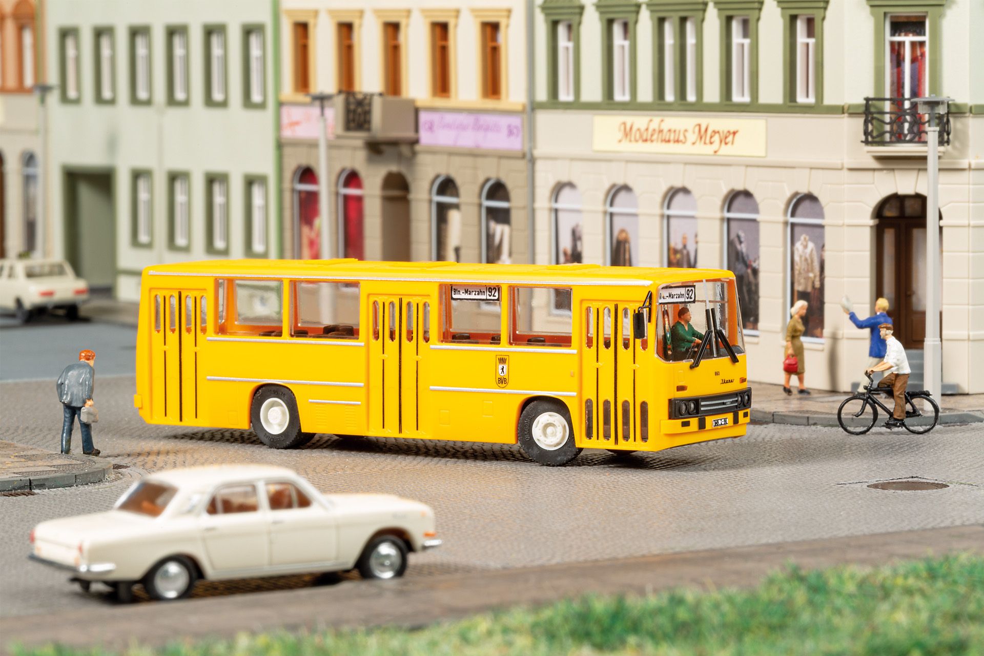 Leuchten, vorbildgerechte Bereifung und Rollfähigkeit zeichnen das Fahrzeug aus. Einlenkbar darstellbare Vorderräder sowie eine zum Selbstbemalen beiliegende Fahrerfigur unterstützen die Gestaltung realistischer Szenen.