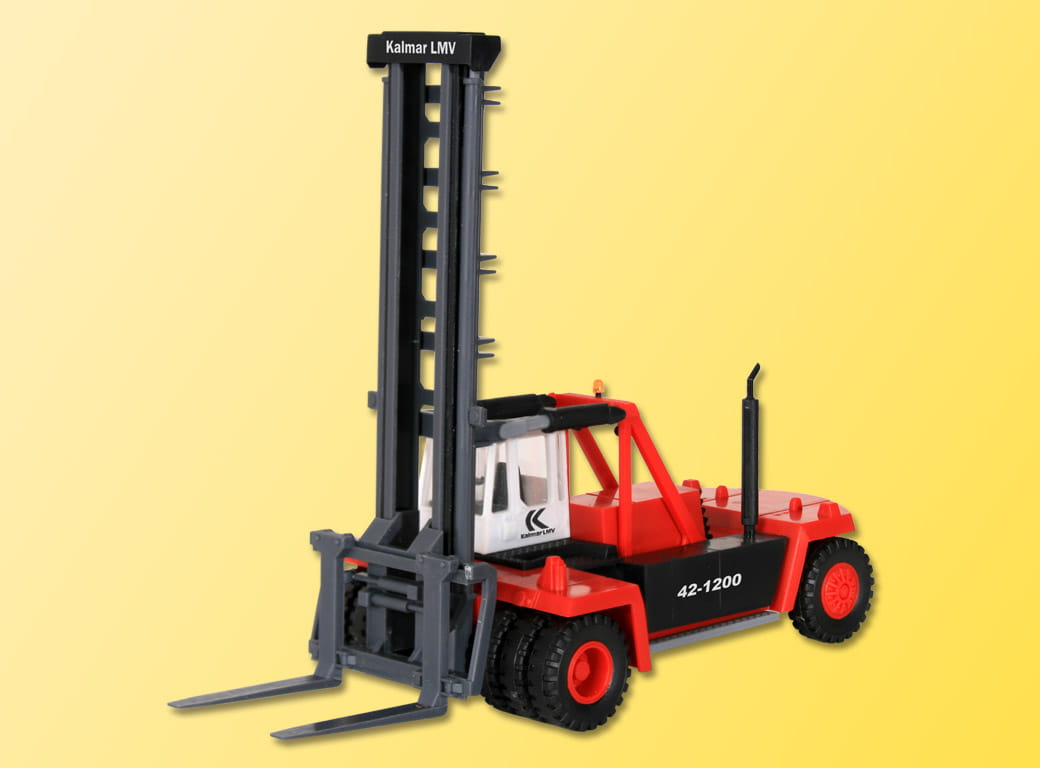KALMAR LMV, DC 42/1200, Tragkraft 42 t, Motorleistung bis 247 kW/335 PS, Gewicht 50 t, max. 25 km/h. Großgerät zum Umschlag, Transport und Stapeln von 20 40 Fuß-Containern, aber auch anderen schweren Lasten in See- und Binnenhäfen, auf Lager- und Umschlagplätzen und in der Industrie. Ebenso wird das Gerät anstelle eines Brückenkranes oder zu dessen Ergänzung, zum Zubringen, Wegführen und Stapeln außerhalb der Reichweite von Container-Kränen, zum Be- und Entladen von LKWs und Bahnwaggons eingesetzt. 12,5x5,2x11,2 cm