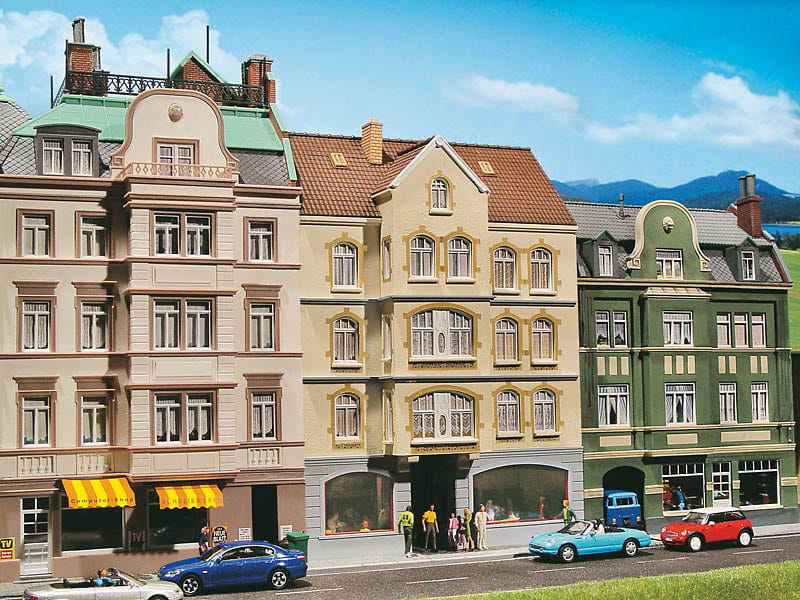 Mehrstöckiges Stadthaus, in dessen Erdgeschoss sich eine Kneipe mit kompletter Inneneinrichtung befindet