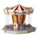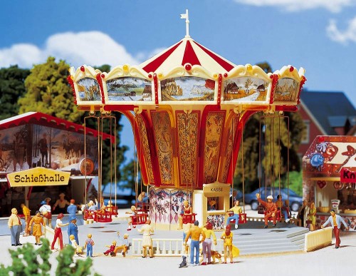 Was wäre ein Kirmesplatz ohne das obligatorische Kettenkarussell? Ausgestattet mit 12 Sitzplätzen, farbig gestalteten Dachsegmenten und indirekt bunt beleuchteten Dachträgerstreben der Mittelsäule. Das Modell ist mit einem Antriebsmotor ausgerüstet
