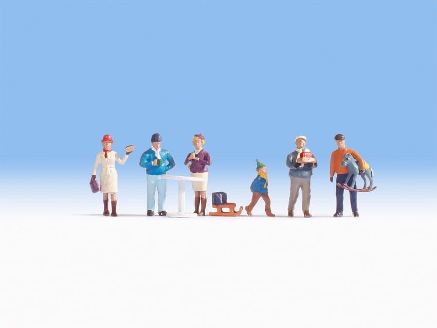 Alle Figuren sind dem Winter entsprechend mit Mütze, Schal, Handschuhen und dicken Winterjacken angezogen. Der kleine Junge zieht einen Holzschlitten mit einem Geschenk darauf hinter sich her. Ein Paar trinkt an einem weißen Stehtisch Glühwein und ein Vater hat für seinen Sohn gerade ein Schaukelpferd als Weihnachtsgeschenk besorgt.