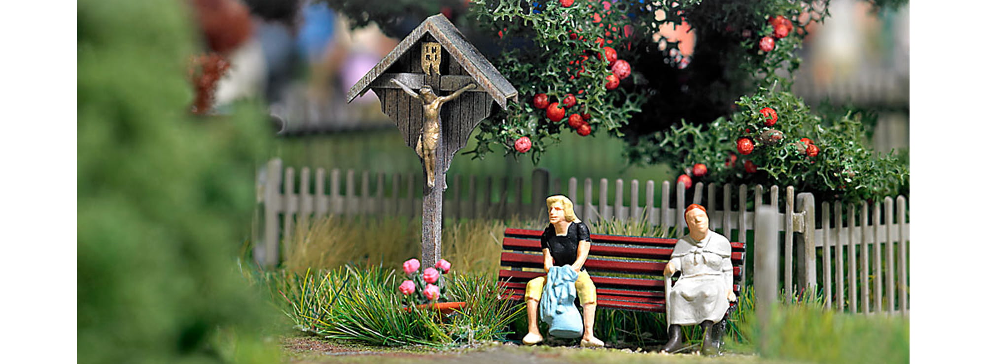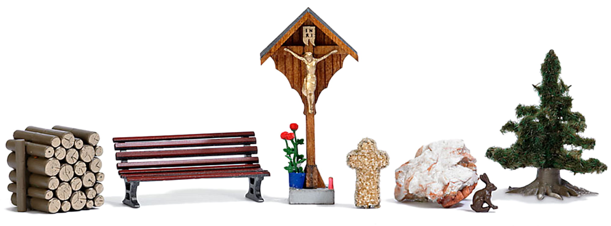 Lieferung inkl. Sitzbank, Holzstapel, Steinfindling, Steinkreuz, Häschen und Jungfichte.