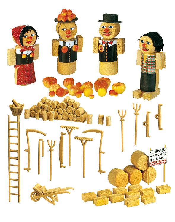 Mit den enthaltenen Strohrollen und Strohballen lassen sich bis zu vier Strohfiguren gestalten. Die passenden Deko- und Zubehörteile sowie Kürbisse, Dekoschild und Sensen liegen bei