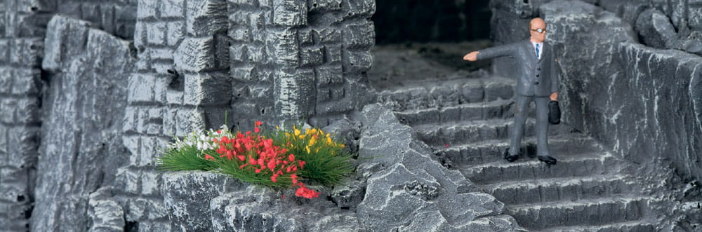 Die Herausforderung, aus einer einheitlich begrasten Fläche eine natürlich wirkende Vegitation zu zaubern, wird mit der Innovation «Grasbüschel« von NOCH so einfach wie nie zuvor. Jede Packung Grasbüschel beinhaltet 105 einzelne Büschel aus extralangen Grasfasern (6 mm) in jeweils zwei Farben. Die Grasbüschel werden einfach an die gewünschte Stelle auf der Modell-Landschaft geklebt. So lassen sich hohe Gräser am Wegesrand, an Uferböschungen oder am Waldrand einfach gestalten. Auch Grasnarben auf Wegen und neben den Bahngleisen sind mit den Grasbüscheln von NOCH kein Problem.105 Grasbüschel blühend: Sattgrüne Grasbüschel, die an den Spitzen mit verschiedenfarbigem Blütenflock veredelt sind