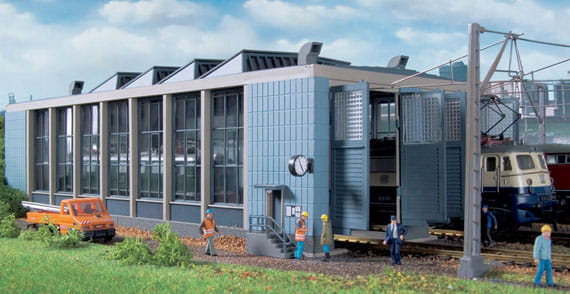 Ob Sie mit Strom oder Diesel fahren ist egal, moderne Lokschuppen müssen sein. Die Türen werden von den ein- und ausfahrenden Lokomotiven selbstverständlich automatisch geöffnet