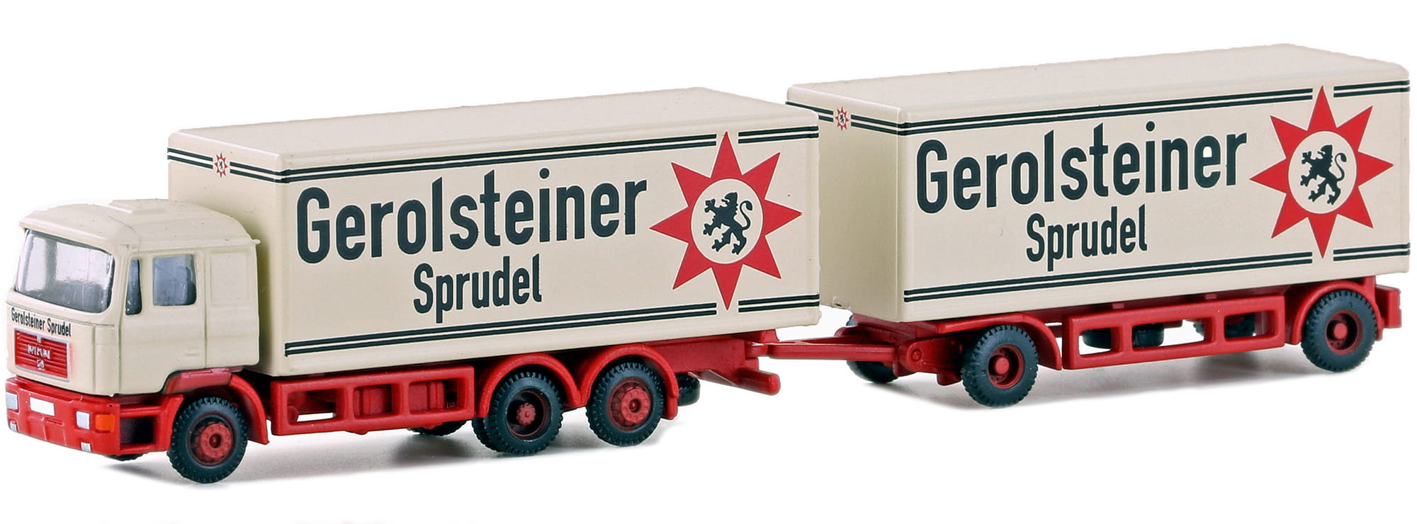 LEMKE Minis Modell-LKW MAN F90 3-achs Koffer-Hängerzug Gerolsteiner | Fertigmodell 1/160 Spur N.
