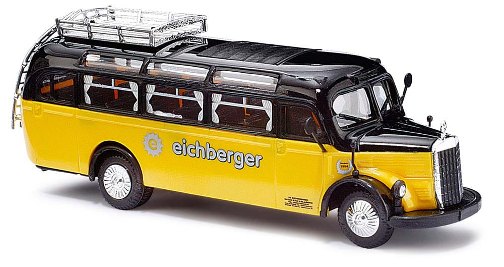 Dieser liebevoll restaurierte Reisebus der Firma Eichberger aus Bad Kellberg ist selbst heute noch im Einsatz. Das Modell hat selbstverständlich auch Vorhänge, wie sein großes Vorbild, die ihm einen ganz besonderen Charme verleihen