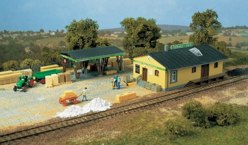 Kleines Handels- und Vorratsgebäude für die Dorfszene mit Verladerampen für Gleisanschluss und überdachter Freifläche. Ein typischer Zweckbau, wie man ihn in Mitteldeutschland findet. Mit diesem Bausatz können Sie auch eine BHG (Bäuerliche Handelsgenossenschaft), typisch für die DDR-Zeit, darstellen. Entsprechende Drucksachen liegen bei
