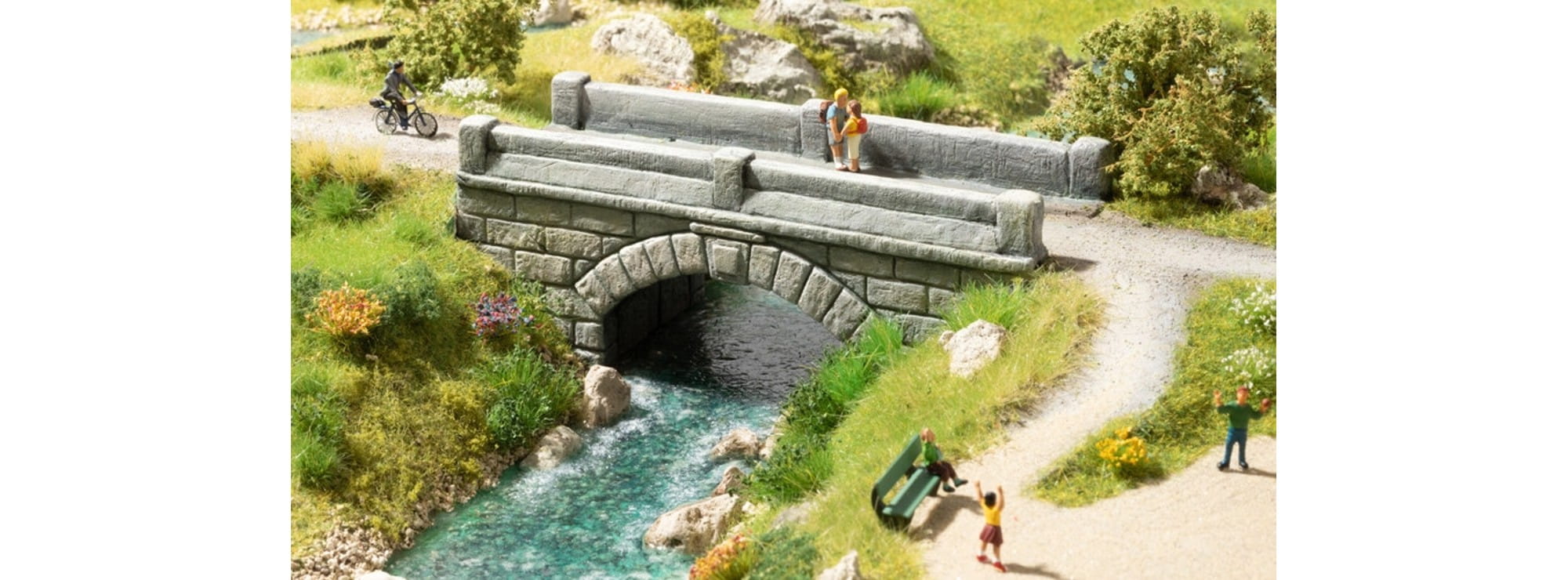 Bäche, Flüsse, Tobel und Schluchten prägen das Landschaftsbild. Brücken ermöglichen seit Urzeiten wichtige Handels- und Verkehrsverbindungen und bringen Menschen zusammen. Unser Team hat sich dieses Jahr den kleinen Brücken angenommen. Diese unauffälligen Bauwerke queren Bäche, kleine Flüsse, Bewässerungsgräben oder Tobel und sind in jedem Dorf und in jeder Stadt zu finden. Die Steinbrücken können aber auch in der freien Natur eingesetzt werden, um auf Wander- und Güterwegen Tobel und Wildbäche zu überqueren. Alle Brücken werden aus dem bekannten NOCH Struktur-Hartschaum hergestellt, der hochrealistische Oberflächenstrukturen garantiert.