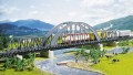 mit 2 Vorflutbrücken und Pfeilern (wie 222548) 4 x 10 und 4 x 5 mm. Die 3 Teile der Brücke können auch einzeln eingesetzt werden. 2-gleisige Bauweise ist möglich, zusätzlich 1 x 222540 notwendig. Halterungen für Oberleitungsmasten liegen bei.