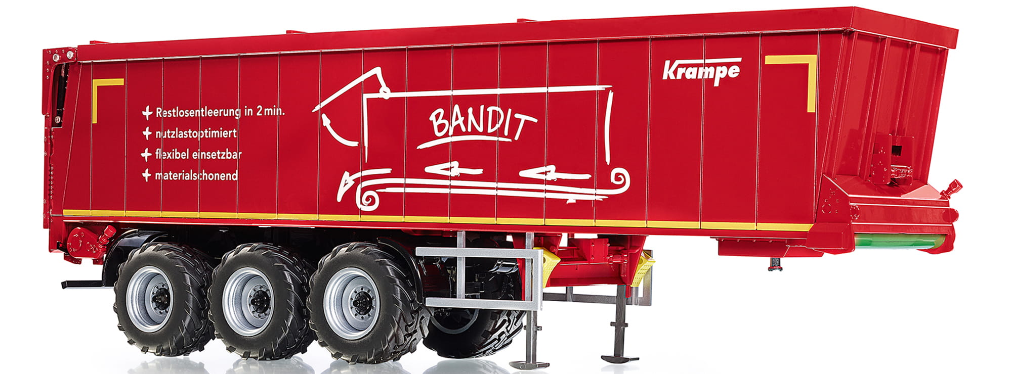 Es ist die neue Transportgeneration in der Landwirtschaft und damit eine Alternative zu den bekannten Abschiebewagen, die bislang für Schüttgut vorherrschende Bedeutung hatten: Der Sattelauflieger Bandit SB II 30/1070 von Krampe wird im Alltagsbetrieb dank der bodenseitigen Rollbandtechnik nicht angehoben und kann somit auch in niedrigen Hallen entleert werden – eine wirkungsvolle Innovation. WIKING miniaturisiert den Horizontalentlader mit maßstäblichen Funktionen und lässt ihn im Krampe-Rot in die Serie fahren. Das System überzeugt, denn die hohe Standsicherheit beim Entladevorgang schafft Berechenbarkeit und öffnet ein breiteres Einsatzspektrum. Neben Gütern wie Getreide, Silage, Dünger, Hackschnitzel, Pellets oder Schreddergut lassen sich auch anhaftende Güter wie Kompost und Klärschlamm nahezu rückstandsfrei entladen. Bei formfesten Gütern wie Kompost erzielt das Rollbandsystem des Bandit SB II 30/1070 beim Entladen einen ungewöhnlich hohen Schüttkegel und schiebt das Zugfahrzeug nebst Anhänger beim Entladevorgang regelrecht nach vorne. Das ist ideal, wenn die Hinterachse des Sattelaufliegers entlastet wird, somit der Grip fehlt und das Gespann wieder von der Entladestelle losfahren muss. Die zügige Entladezeit von 80 Sekunden schlägt bei kurzen Zyklen zusätzlich positiv zu Buche. Die einfache Reinigung ist gegenüber dem Schubbodensystem ein weiterer großer Pluspunkt. Ideal ist auch der rutschfeste Boden, der sich in Verbindung mit der Beladeoption auch zum Transport von Pallettenware, Strohballen oder Bigpacks eignet. Das Krampe-Vorbild verfügt über ein zulässiges Gesamtgewicht von 35 Tonnen, die Nutzlast liegt bei 27 Tonnen. Alle Funktionen maßstabsgerecht simulierbar Selbstverständlich kann die heckseitige Klappe vollständig nach oben bewegt werden, sodass ein müheloses Abladen der Fracht möglich wird. An der geschlossenen Mulde lässt sich heckseitig mit einer Hebelbewegung die Entladeöffnung zur besseren Dosierung von feinem Schüttgut freigeben. Überdies sind die Stützen im vorderen Bereich des Aufliegers variabel herausfahrbar, sodass der Auflieger auch abgekoppelt einen festen vorbildgerechten Stand erreicht. Wie es sich für WIKING gehört, wird auf die Bremsklötze ein besonderes Augenmerk gelegt. Diese sind auf beiden Aufliegerseiten eingesteckt und können bei Bedarf unterhalb der Räder in Position gebracht werden.