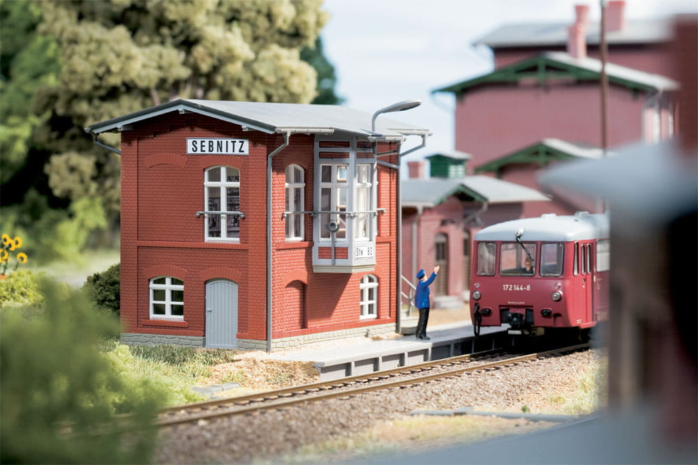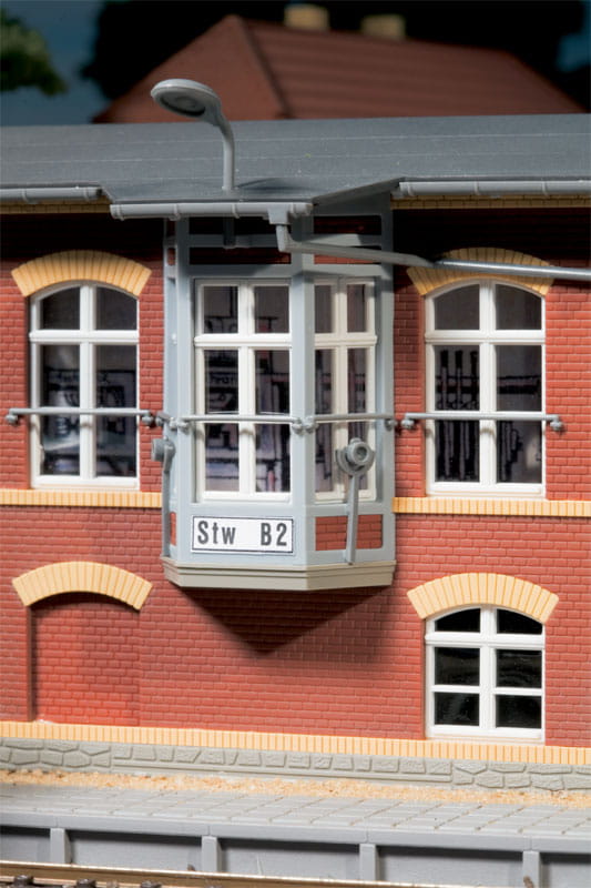 Die schmückenden gelben Ziegelkanten liegen auch in rot bei. Wahlweise kann das Stellwerk mit Kanzel gestaltet werden.