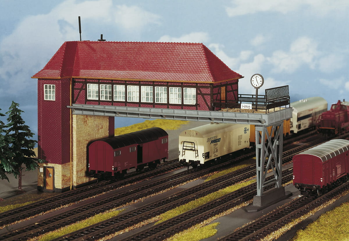 Bausatz. Das Stellwerk eignet sich besonders zur Montage der Signalköpfe von Viessmann Art. 4751 – 4753 in Multiplex-Technologie und wird dadurch zum Blickfang eines jeden Gleisfeldes. Überspannt 4 Gleise.