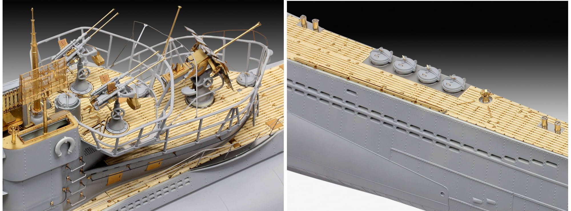 Modellbausatz der am häufigsten gebauten U-Boot Klasse der Geschichte. Merkmal des Typ VII C/41 war der "große Wintergarten" mit zusätzlicher Bewaffnung und der aufrichtbare Schnorchelmast.