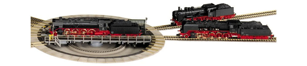 Die Drehscheibe ist in vorbildgetreuer Gruben-Bauweise und in vorbildlicher Darstellung sämtlicher Einzelheiten gefertigt. Die Grundausstattung der Drehscheibe besteht aus 6 Auffahrgleisen und 4 Blindstutzen. Die Auffahrgleise können im Winkel von 7,5° beliebig in Anzahl und Anordnung umgesteckt werden und durch Drehscheiben-Ergänzungs-Sets 6153 auf bis zu insgesamt 48 Gleisanschlüsse erweitert werden.Die quot;denkendequot; Drehscheibe: Mit dem Schalter 6910 wird die Drehbewegung der Drehscheibe gesteuert, um den entsprechenden Gleisabgang zu erreichen. Die Fahrstrom-Einspeisung erfolgt in die Drehbrücke. Der gewünschte Gleisabgang, mit dem die Drehbrücke verbunden ist, wird mit dem Schalter 6910 elektrisch zugeschaltet. Alle anderen Gleisabgänge (auch ein gegenüberliegender) sind dann automatisch stromlos. Somit können maximal 48 Gleisabgänge angesteuert und elektrisch einzeln zugeschaltet werden, ohne dass eine zusätzliche Verdrahtung erforderlich ist