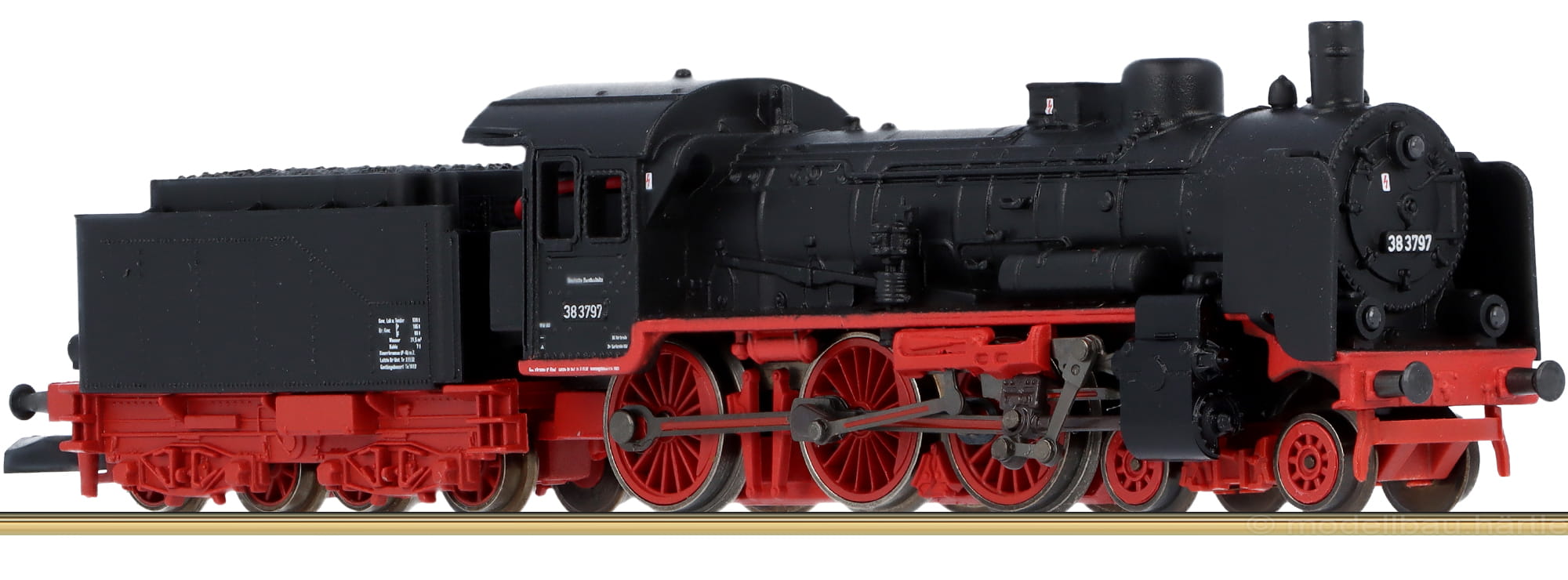 Vorbild: Personenzuglokomotive BR 38 mit Kastentender 2´2´T21,5, mit kleinen Wagner-Windleitblechen im Zustand der Epoche IIIa um 1952.