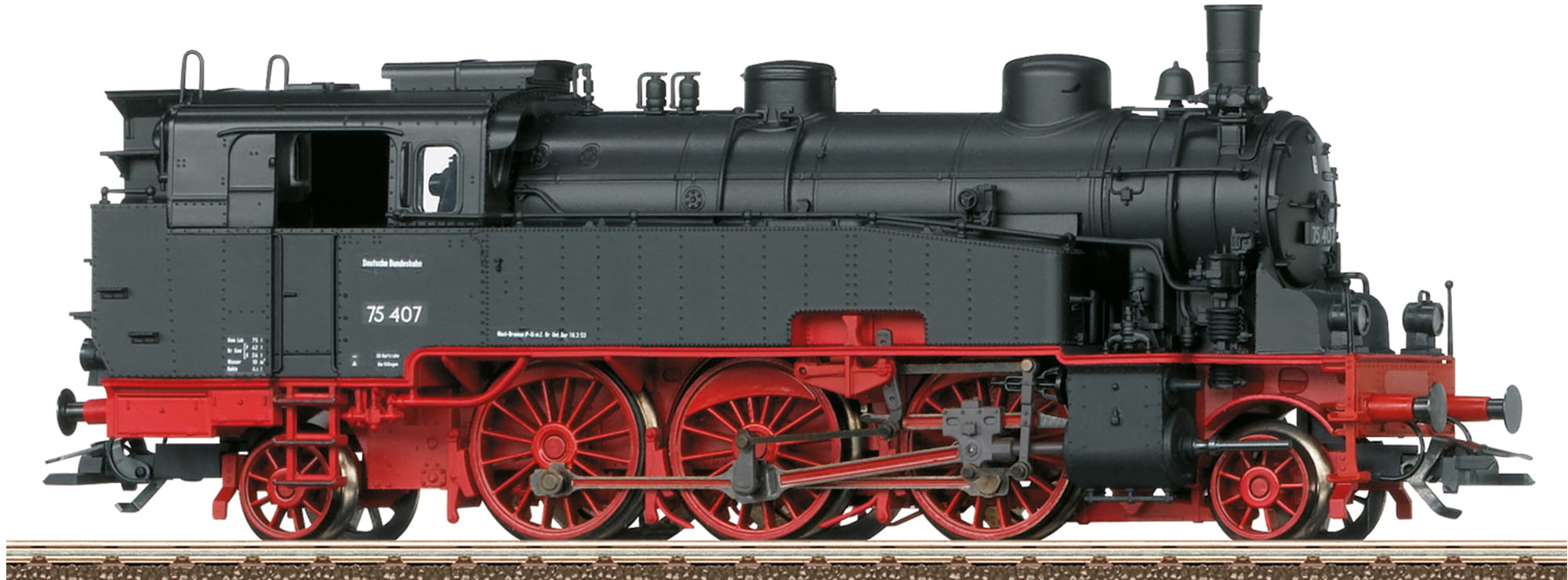 Vorbild: Tenderdampflokomotive BR 75.4 (ehemalige badische VI c) der Deutschen Bundesbahn (DB). Ausführung mit Zweilicht-Spitzensignal, Rauchkammertür mit Zentralverschluss und genieteten Wasserkästen. Betriebsnummer 75 407. Betriebszustand um 1953.