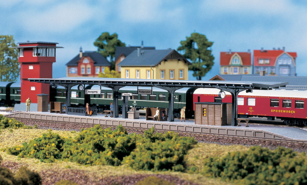 Mit Teerpappdach und Stahlträgerkonstruktion sowie Unterführung. Gepäckablagetische, Bänke mit Werbeflächen, Papierkörbe, Bahnsteig- und Fahrtrichtungsanzeige, Lautsprecher, Uhren und Hinweisschilder liegen bei. Ein Fernsprechhäuschen und ein Warteraum, ein Brunnen und Gleisübergänge für 2 Gleise ergänzen die reichhaltige Ausstattung.