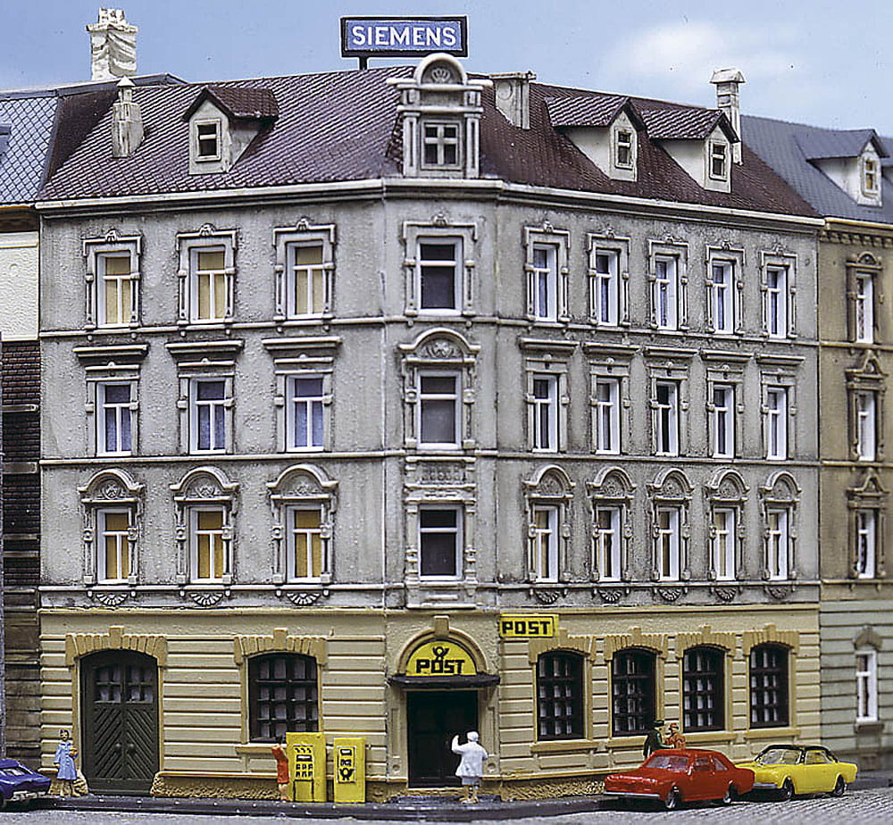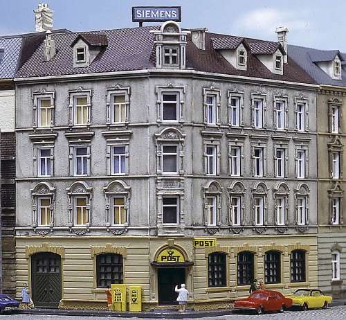 Gealtertes Eckwohnhaus mit einem Postamt im Erdgeschoss.