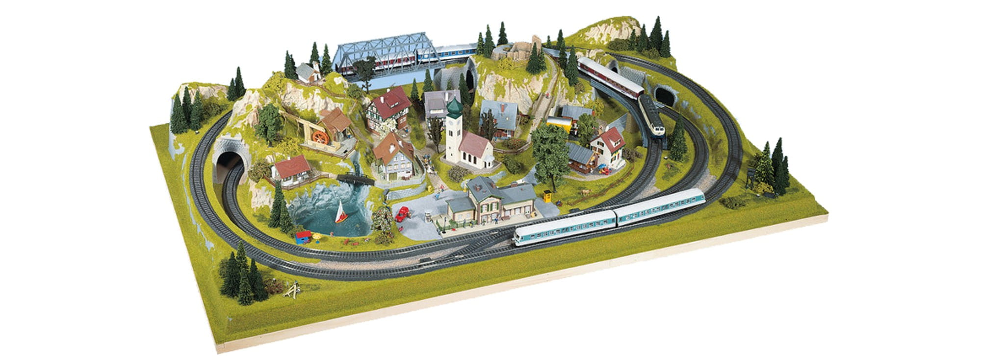 "Schönmühlen" ist eine Anlage in der beliebten Mittelgröße mit einer interessanten Gleisstrecke, die über zwei Brücken und durch zwei Tunnel führt. Ihren besonderen Reiz erhält sie durch eine liebenswerte Kleinstadt mit Kirche, Bahnhof und Güterschuppen sowie durch einen kleinen See und eine Landstraße mit unbeschranktem Bahnübergang. Der besondere Blickfang ist aber eine funktionsfähige Wassermühle, deren Wasserrad durch einen Wasserkreislauf mit Pumpe angetrieben wird. Außerdem erlauben zwei Bahnstromkreise, Abstellgleis und Überholgleis einen abwechslungsreichen Bahnbetrieb.