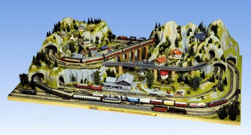 - Zawartość: podstawa makiety ręcznie malowana i pokryta trawą, wbudowane tunele, zestawy mostów do sklejania, plany torowiska.