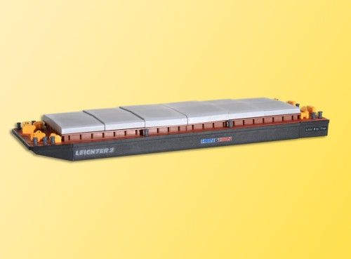 28 x 9 x 2,3 cm. Schubleichter sind unbemannte offene Wasserfahrzeuge, die genormte Größen aufweisen. In der Binnenschiffahrt werden in der Regel zwei oder vier Leichter zu einem starren Schiffsverband zusammengekoppelt. Ihre Anzahl ist abhängig von der Wasserbreite eines Flußlaufes oder Kanals. Einen solchen Schubleichter, der überall auf europäischen Wasserstraßen anzutreffen ist, hat kibri originalgetreu nachempfunden und ein Modell entwickelt, bei dem die kastenförmige Form mit nur geringen Tiefgang gut zum Ausdruck kommt. Mit den auch im Modell beweglichen Rolluken läßt sich die Schiffsladung aus Erz, Sand oder Getreide abdecken