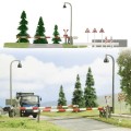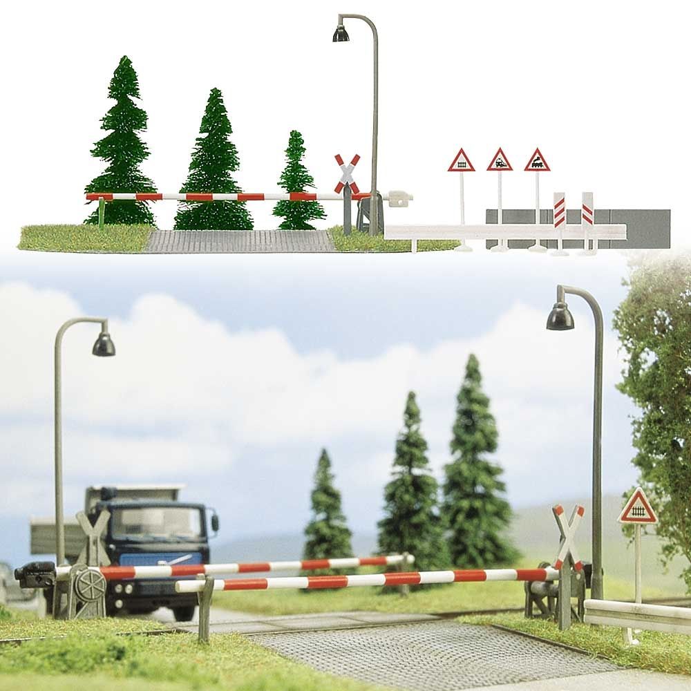 Grundplatte mit Kopfsteinpflaster-Fahrbahn, 2 Schranken (ohne Funktion), 2 Andreaskreuzen, 2 Lampen (ohne Funktion), Leitplanken, Begrenzungspfosten, Verkehrsschilder, 3 Tannen.