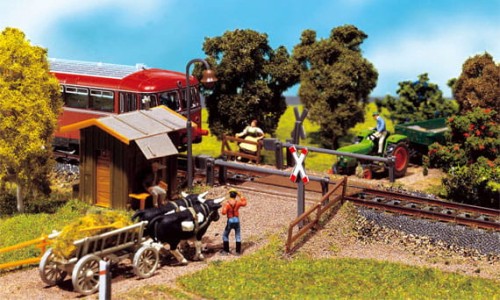 Feldweg-Übergang mit Schrankenwärterhaus und beweglichen Schlagbäumen. Für alle geraden oder gebogenen Modellgleise
