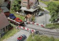 Beschrankter Bahnübergang, Epoche I, mit 2 kleinen Häuschen, Fußgänger-Drehkreuz und Schranken.
