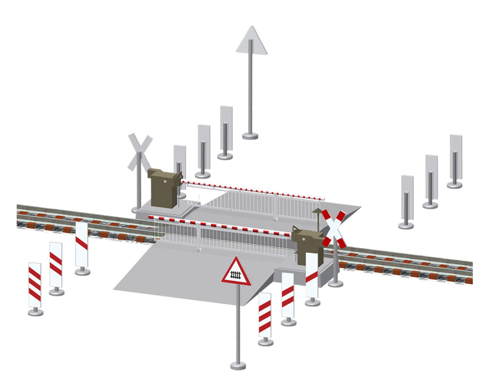 Bahnübergang mit zwei unterflur angetriebenen Bahnschranken, jeweils mit filigranem Behang und Läutewerkattrappe ausgestattet. Die Antriebe ermöglichen vorbildgetreu langsames Öffnen und Schließen der Schranken.