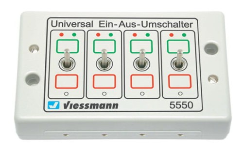 4 Umschalter zum einfachen Schalten von Beleuchtungen, Signalen usw. sowie für Blocksteuerungen. Zur Zugbeeinflussung durch beiliegende Koppelhebel umwandelbar in 2 zweipolige Umschalter