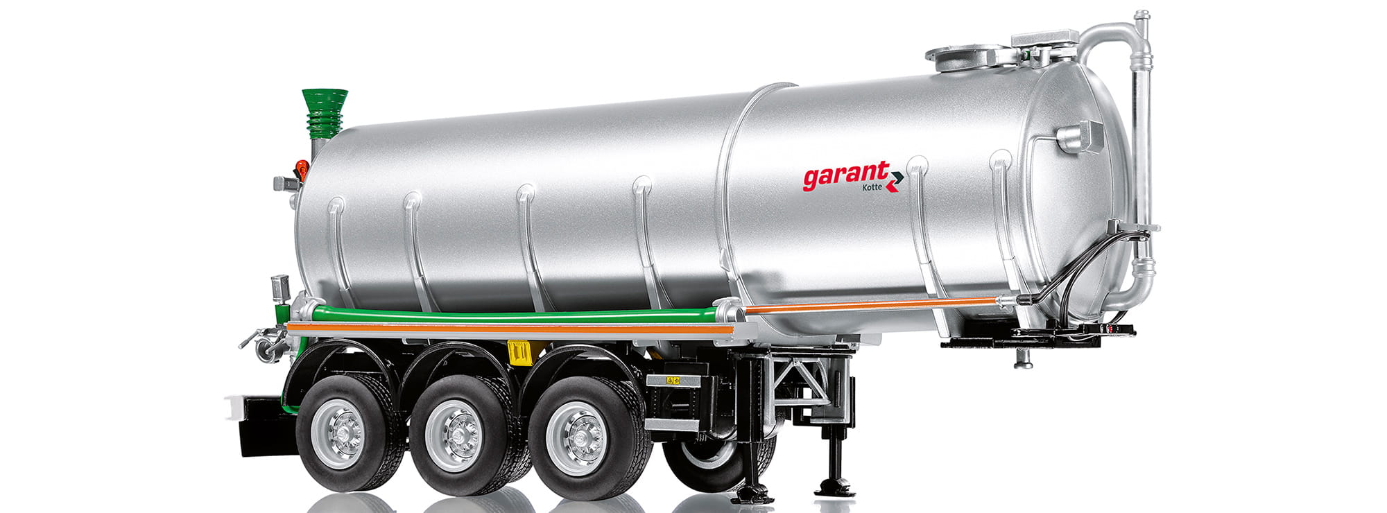 Gerade in den letzten Jahren gehören Tanksattelauflieger angesichts der spezialisierten Betriebe bei gleichzeitig gewachsener Betriebsgröße zum Alltag in der Landwirtschaft. Mit dem Kotte garant Tanksattelauflieger TSA 30.000 transportieren Lohnunternehmen anfallenden Wirtschaftsdünger besonders auf längeren Strecken zügig und kostengünstig. Durch die kompakte Bauweise des Tankaufliegers, den WIKING 32-fach mit schwarzem Fahrgestell und alu-weißem Tank miniaturisiert, eignet er sich vorbildgerecht für ein Gespann mit dem authentischen MAN TGS 18.510 4x4. Der Landmaschinenhersteller Kotte aus dem niedersächsischen Rieste erreicht mit dem TSA der Garant-Baureihe hohe Einsatzsicherheit und schafft zugleich eine hochwertige, maßgeschneiderte Ausstattung für effiziente und wirtschaftliche Arbeitsabläufe. Die Stützlastübertragung vom Vorderwagen auf die Zugmaschine ermöglicht in Kombination mit der Luftfederung ein zulässiges Gesamtgewicht von rund 34 Tonnen. Da der Vakuumkompressor mit der patentierten Drehdurchführung mechanisch angetrieben wird, steht für die Befüllhilfe die komplette hydraulische Leistung der Zugmaschine zur Verfügung. Der Andocktrichter an der Rückwand ist so positioniert, dass das Ausbringfahrzeug die Gülle effizient überladen kann. Ein Pumpensumpf sorgt für eine vollständige Entleerung des Behälters. Rückwärtige Hinterachse lenkt vorbildgerecht mit Das 1:32-Modell entsteht in Handarbeit, zahlreiche Bauteile aus Zinkdruckguss und Kunststoff werden präzisionsgenau zusammengefügt. Im abgekoppelten Zustand kann der Tanksattelauflieger mühelos auf die ausziehbaren Stützen gestellt werden, sodass eine vorbildgerechte Alltagspräsentation möglich ist. Heckseitig können überdies die Kupplungsarmaturen zum Ablassen praxisgerecht geschwenkt werden. Genauso gut lässt sich das heckseitige Bedienpult öffnen und wieder verschließen. Um die vorbildgerechte Wendigkeit herzustellen, ist die Hinterachse lenkbar angelegt, die Achsen sind gefedert und die Funktion der Lift-Achse lässt sich nachvollziehen.