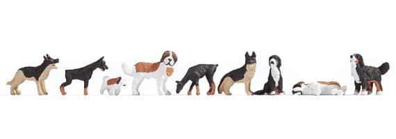 Neun handbemalte Modellbahnfiguren; dargestellte Hunderassen: Schäferhund, Bernhardiner, Berner Sennenhund, sowie ein Dobermann in verschiedenen Posen.