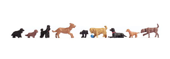 Neun handbemalte Modellbahnfiguren; dargestellte Hunderassen: Golden Retriever, Labrador (Labrador Welpe), Dackel, Cocker Spaniel, Pudel und eine bucklige Katze in verschiedenen Posen.