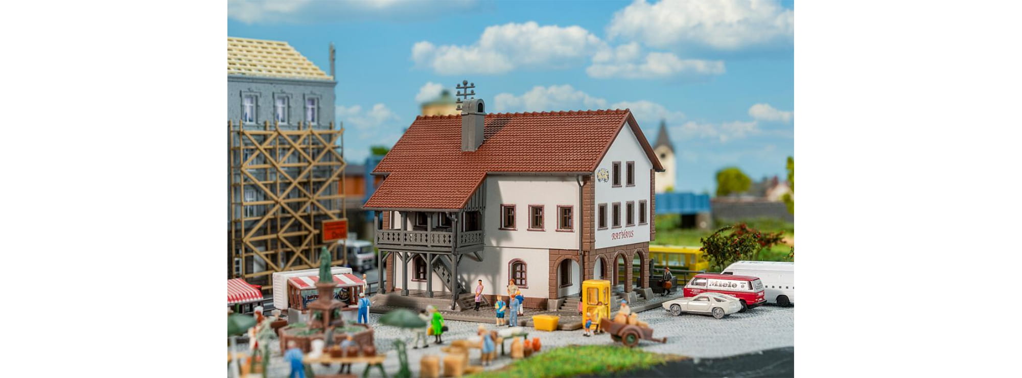 Das dreigeschossige Kleinstadtrathaus mit seinem markanten dritten Giebel, dem einladenden Arkadengang und dem seitlichen Balkon mit Treppenzugang ist ein wahrer Blickfang auf der Modellanlage! Der Bausatz umfasst zudem eine detailreiche Bodenplatte, einen Glockenturm und einen malerischen Brunnen. Damit lässt sich mühelos eine charmante Dorfszenerie kreieren!