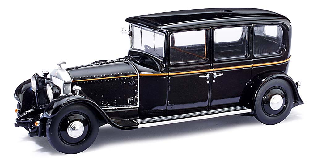 Um den ein wenig »in die Jahre gekommenen« Silver Ghost abzulösen, dessen Produktion 1925 auslaufen sollte, entschied der britische Nobelautomobilhersteller 1926, das Modell Phantom auf den Markt zu bringen. Zunächst jedoch sollte das Fahrzeug unter der Bezeichnung »New Phantom« vorgestellt werden, doch da dieser Typenname für mehrere Modernisierungsschritte beibehalten werden sollte, entschloss man sich, römische Ziffern anzuschließen. Doch leider wurde nur der Motor des Phantoms einer »Verjüngungskur« unterzogen, das Fahrgestell ließ man außer Acht, was Rolls Royce viel Kritik einbrachte. Kurzer Hand entschied man, ein weiteres Nachfolgemodell, den Phantom II nachzuschieben. Im Produktionszeitraum von 1929-1935 entstanden 1.281 Fahrgestelle in der Rolls Royce-Fabrik in Derby, die auf Kundenwunsch von einem Stellmacher aufgebaut wurden. Einige der bekannten Karosseriebauern für RR-Automobile waren Park Ward, Thrupp & Maberly, Mulliner und Hooper. Der Reihensechszylinder-OHV-Motor mit 7.668 cm3 Hubraum erreichte eine Leistung von 120 PS (88KW). Leider ohne Motor, dafür mit allen erdenklichen Details, begeistert das 1:87er Modell. Mit feinen silbernen Drucken von Türgriffen, Zierleisten und Trittblechen werden edle Akzente gesetzt. Ein filigraner Außen- und Innenspiegel ist eine Selbstverständlichkeit, genauso wie die freistehende geflügelte Kühlerfigur »Spirit of Ecstasy« (auch »Emily« genannt). Chromglänzende Scheinwerfer, Felgen und Kühlergrill sorgen für einen perfekten glänzenden Auftritt.