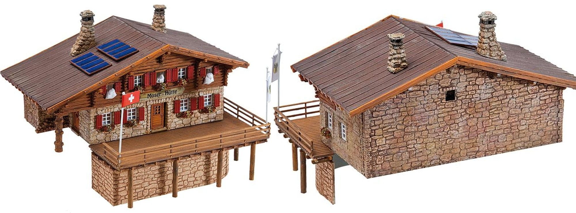 Hochgebirgshütte Moser-Hütte in 2-stöckiger Holzbauweise mit großer, vorgebauter Sonnenterrasse und gemauertem Fundament, ausgestattet mit Tischen, Bänken, Brunnen und Solarelementen auf dem Dach.