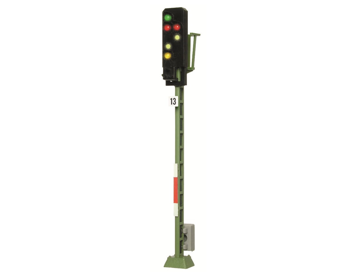 Signal der Einheitsbauart mit filigranem Messingmast in originalgetreuer Lackierung. Flexible Montage durch beiliegende Schrauben und Befestigungsclip für Teppichbahnen. Mit 6 LEDs, wartungsfrei. Signalbilder Hp0, Hp0/Sh1, Hp1 und Hp2. Passendes Steuermodul: Art. 5223. Höhe: 155 mm.